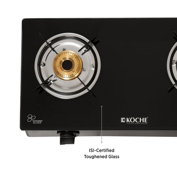 Designed for Indian kitchens, the Köche Bren 2 Burner cooktop blends compact size with durable Indian brass burners, 6mm toughened glass and high thermal efficiency.